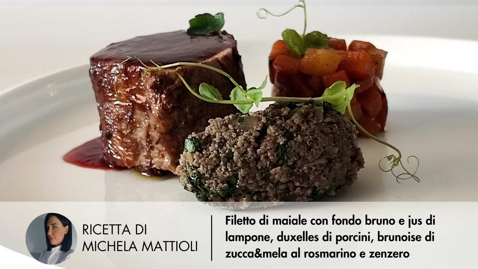 Scopri la Ricetta di Chef Mattioli | Filetto di maiale con fondo bruno e jus di lampone, duxelles di porcini, brunoise di zucca&mela al rosmarino e zenzero